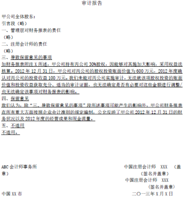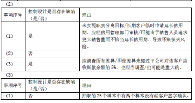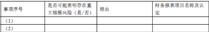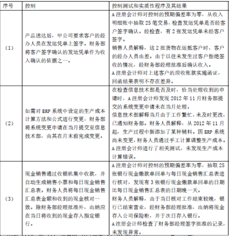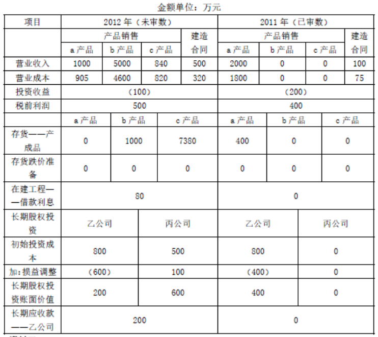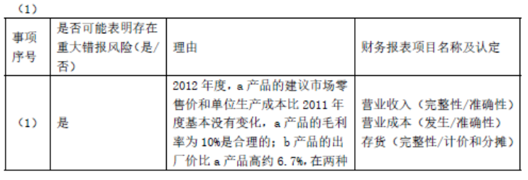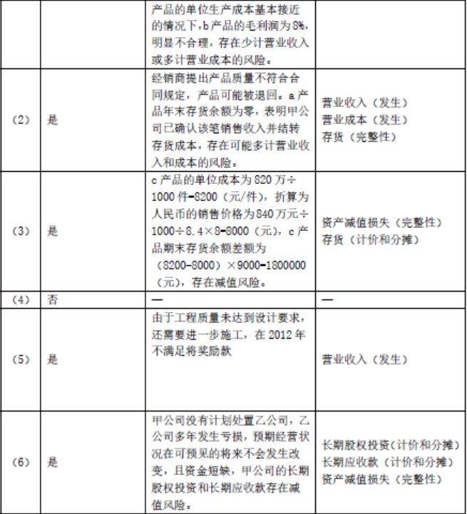 问题 甲公司是 ABC会计师事务所的常年审计客户,拥有乙公司和丙公司两家联营公司。甲公司主要从事建材的生产、销售以及建筑安装工程。A注册会计师负责审计甲公司 2012年度财务报表,拟于 2013年 4月 1日出具审计报告。财务报表整体的重要性为 25万元。资料一:A注册会计师在审计工作底稿中记录了所了解的甲公司情况及其环境,部分内容摘录如下:(1)甲公司采用经销商买断方式销售 a和 b产品。2012年度,a产品的建议市场零售价、出厂价和单位生产成本较 2011年基本没有变化。b产品是甲公司 2012年 2月推出的新产品,其建议市场零售价比 a产品高 20%。a和 b产品的单位生产成本接近,其出厂价分别低于各自建议市场零售价的 10%和 20%。 (2)a产品于 2012年 11月停产。2012年末,某经销商采用交款提货方式购买最后一批 a产品。甲公司已收到货款 200万元。并已开具发票和发运凭单。经销商在验收时发现该批产品质量不符合合同要求,双方尚未就解决方案达成一致意见。 (3)甲公司的记账本位币为人民币。2012年 9月,甲公司与某德国客户签订合同,按固定销售价格定制 10000件 c产品,以欧元计价和结算。甲公司一次性投料生产该批产品,并于2012年 10月 1日销售 1000件,其余 9000件按合同约定于 2013年 1月销售。甲公司未生产其他批次 c产品。(假定 2012年 10月 1日即期汇率为 1欧元=8.4元人民币,2012年 12月 31日即期汇率为 1欧元=8元人民币) (4)甲公司于 2012年 3月 1日借入 2000万元、年利率为 8%的专门借款,用于已开工建设并预计于 2013年末完工的新生产地。甲公司无其他带息债务。因甲公司与施工方对工程质量存在纠纷,该工程于 2012年 5月 1日至 2012年 8月 31日中断。 (5)甲公司于 2011年起从事建筑安装工程,截至 2012年末仅承揽一项业务,建造合同约定,工程建设期为 18个月,工程总价为 500万元,如果工程提前 3个月完工,并且质量符合设计要求,客户另付 100万元奖励款,工程于 2011年 10月 1日开工,于 2012年 12月末基本完工。经监理人员认定,工程质量未达到设计要求,还需进一步施工。 (6)甲公司持有乙公司 40%股权,目前无处置计划。乙公司多年亏损,2012年度亏损 500万元,预期其经营状况在未来 5年内不会发生改变。2012年 5月,乙公司因资金短缺,由甲公司为其代垫采购款 200万元,并约定 2年后还款。资料二:A注册会计师在审计工作底稿中记录了甲公司的财务数据,部分内容摘录如下: 资料三:A注册会计师在审计工作底稿中记录了甲公司销售与收款循环的内部控制,部分内容摘录如下: 资料四:A注册会计师在审计工作底稿中记录了实施的控制测试和实质性程序及其结果,部分内容摘录如下: 资料五: 甲公司持有丙公司 30%股权,因能够对其施加重大影响,采用权益法计算。A注册会计师将丙公司识别为具有财务重大性的重要组成部分,提出对其实施审计。丙公司董事会予以拒绝,但提供了经其他会计师事务所审阅的 2012年财务报表。 要求: (1)针对资料一第(1)至(6)项,结合资料二,假定不考虑其他条件,逐项指出资料一所列事项是否可能表明存在重大错报风险。如果认为存在重大错报风险,简要说明理由,并说明该风险主要与哪些财务报表项目(仅限于营业收入、营业成本、资产减值损失、财务费用、存货、长期应收款、长期股权投资和在建工程)的哪些认定相关。将答案直接填入答题区的相应表格内。 (2)针对材料第(1)至(3)项,假定不考虑其他条件,逐项指出资料三所列控制的设计是否存在缺陷。如认为存在缺陷,需要说明理由。将答案直接填入答题区的相应表格内。 (3)针对资料四第(1)至(3)项,假定这些控制的设计有效并得到执行,根据控制测试和实质性程序及其结果,逐项指出资料四所列控制运行是否有效,如认为运行无效,简要说明理由。将答案直接填入答题区的相应表格内。 (4)针对资料五,结合资料二,假定不考虑其他因素(如所得税),代 A注册会计师判断应出具何种类型的审计报告,并续编审计报告。在答题区下划线处填列,如果部分下划线不适用,填写“不适用”。