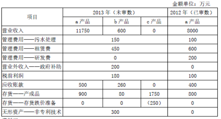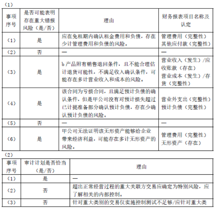问题 甲公司是 ABC会计师事务所的常年审计客户。A注册会计师负责审计甲公司 2013年度财务报表,确定财务报表整体的重要性为 240万元。(本题资料包括:资料一资料二资料三资料四资料五资料六) 资料一: A注册会计师在审计工作底稿中记录了所了解的甲公司情况及其环境,部分内容摘录如下: (1)甲公司原租用的办公楼月租金为 50万元。自 2013年 10月 1日起,甲公司租用新办公楼,租期一年,月租金 80万元,免租期 3个月。 (2)2012年度,甲公司直销了 100件 a产品。2013年,甲公司引入经销商买断销售模式,对经销商的售价是直销价的 90%,直销价较 2012年基本没有变化。2013年度,甲公司共销售 150件 a产品,其中 20%销售给经销商。 (3)2013年 10月,甲公司推出新产品 b产品,单价 60万元。合同约定,客户在购买产品一个月后付款;如果在购买产品三个月内发现质量问题,客户有权退货。截至 2013年 12月 31日,甲公司售出 10件 b产品。因上市时间较短,管理层无法合理估计退货率。 (4)2013年 10月,甲公司与乙公司签订销售合同,按每件 150万元的价格为其定制 20件c产品,约定 2014年 3月交货,如不能按期交货,甲公司需支付总价款的 20%作为违约金。签订合同后,原材料价格上涨导致 c产品成本上升。截至 2013年 12月 31日,甲公司已生产 10件 c产品,单位成本为 175万元。 (5)2013年 12月,甲公司首次获得 200万元政府补助。相关文件规定,该补助用于补偿历年累计发生的污水处理支出。 (6)甲公司自 2011年起研发一项新产品技术,于 2013年 12月末完成技术开发工作,并确认无形资产 300万元。甲公司拟将其出售,因受国家产业政策的影响,市场对该类新产品尚无需求。资料二:A注册会计师在审计工作底稿中记录了有关制造费用的财务数据,部分内容摘录如下: 资料三:A注册会计师在审计工作底稿中记录了审计计划,部分内容摘录如下: (1)A注册会计师认为,如果发生与关联方及其交易相关的财务报表项目和披露错报,即 使其金额低于财务报表整体重要性,仍可能影响财务报表使用者依据财务报表作出的经济决 策,因此,确定与关联方及其交易相关的财务报表项目和披露的重要性水平为 150万元。 (2)2013年,甲公司以 8000万元的价格向关联方购买一条生产线。A注册会计师认为该交易超出甲公司正常经营过程,很可能不存在相关的内部控制,拟直接实施实质性程序。 (3)甲公司 2013年度销售费用为 900万元。A注册会计师认为重大错报风险较低,拟仅实施控制测试。 资料四: A注册会计师在审计工作底稿中记录了实施的控制测试,部分内容摘录如下: 资料五:A注册会计师在审计工作底稿中记录了实施的实质性程序,部分内容摘录如下: (1)甲公司年末应付账款余额为 1000万元。A注册会计师选取前 10大供货商实施函证,均收到回函。回函显示一笔 5万元的差异,管理层同意调整。因回函总额占应付账款余额的70%,错报明显微小且已更正,A注册会计师没有对剩余总体实施其他审计程序。 (2)2013年底,甲公司存在重大未决诉讼,内部法律顾问和外聘律师均认为败诉可能性较低,因此,管理层没有确认预计负债。A注册会计师认为该事项存在重大错报风险,检查了相关文件,并获取了管理层和内部法律顾问的书面声明,据此认可管理层的判断。 (3)甲公司财务人员手工编制了应收账款账龄分析表。A注册会计师了解了相关控制,认为控制设计有效,并就账龄分析表中账龄结构变化较大的项目询问了相关人员。A注册会计师基于该账龄分析表测试了坏账准备中按账龄法计提的部分。 资料六:A注册会计师在审计过程中识别并累积了 3笔错报,并认为这些错报均不重大,同意管理层不予调整。甲公司 2013年度未更正错报列示如下(不考虑税务影响): 要求: (1)针对资料一第(1)至(6)项,结合资料二,假定不考虑其他条件,逐项指出资料一所列事项是否可能表明存在重大错报风险。如果认为可能表明存在重大错报风险,简要说明理由,并说明该风险主要与哪些财务报表项目的哪些认定相关(不考虑税务影响)。 (2)针对资料三第(1)至(3)项,假定不考虑其他条件,逐项指出资料三所列审计计划是否恰当。如不恰当,简要说明理由。 (3)针对资料四第(1)至(3)项,假定不考虑其他条件,逐项指出资料四所列控制测试是否恰当。如不恰当,提出改进建议。 (4)针对资料五第(1)至(3)项,假定不考虑其他条件,逐项指出资料五所列实质性程序是否恰当。如不恰当,简要说明理由。 (5)针对资料六,结合资料二,假定不考虑其他条件,指出 A注册会计师的判断存在哪些不当之处,并简要说明理由。