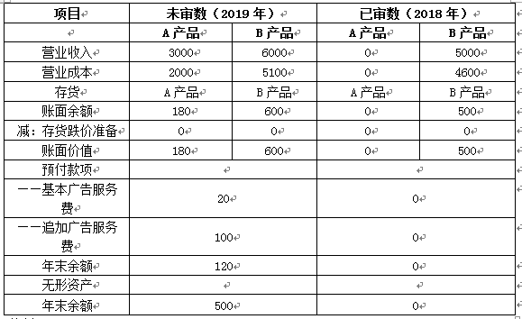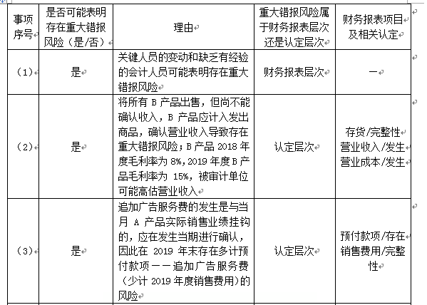 问题 甲公司主要从事小型电子消费品的生产和销售。甲公司日常交易采用自动化信息系统(以下简称“系统”)和手工控制相结合的方式。A注册会计师是甲公司2019年度财务报表审计业务的项目合伙人。 资料一: A注册会计师在审计工作底稿中记录了所了解的甲公司及其环境的情况,部分内容摘录如下: (1)甲公司财务总监已在甲公司工作超过6年,于2019年9月劳动合同到期后被甲公司的竞争对手高薪聘请。由于工作压力大,甲公司会计部门人员流动频繁,除会计主管服务期超过4年外,其余人员的平均服务期少于2年。 (2)2019年12月31日,甲公司将所有库存的B产品出售给了乙公司,双方协商一致确定了2个月的退货期限。甲公司无法根据过去的经验估计该批产品的退货率。 (3)2019年9月1日,甲公司与丁公司签订协议,自当月起,由丁公司为甲公司于2019年第4季度投放市场的一款新产品——A产品提供为期12个月的广告服务。甲公司于2019年9月1日向丁公司预付6个月基本广告服务费,每月10万元。另外,按照协议约定,甲公司于每月末按当月A产品销售收入的5%向丁公司另行支付追加广告服务费。 (4)自2019年11月起,甲公司将主要产品交货方式由在甲公司仓库交货,改为运至客户指定交货地点交客户签收,但客户需承担甲公司因此而发生运费的80%。 (5)甲公司从2016年起将一项非专利技术的研究开发工作提上日程,至2019年年末该非专利技术的研发工作正式完成。甲公司因该非专利技术确认了无形资产500万元,并拟短期内出售该无形资产。但是受国家政策影响,市场对该非专利技术并无需求。 资料二: A注册会计师在审计工作底稿中记录了所获取的甲公司财务数据,部分内容摘录如下:(金额单位:万元) 资料三: A注册会计师在审计工作底稿中记录了针对销售交易实施的控制测试,部分内容摘录如下: 资料四: A注册会计师在审计工作底稿中记录了实施的实质性程序,部分内容摘录如下: (1)甲公司年末应付账款余额为1000万元。A注册会计师选取前10大供货商实施函证,均收到回函。回函显示一笔5万元的差异,管理层同意调整。因回函总额占应付账款余额的70%,错报明显微小且已更正,A注册会计师没有对剩余总体实施其他审计程序。 (2)2019年,甲公司以8000万元的价格向关联方购买一条生产线。A注册会计师认为该交易超出甲公司正常经营过程,很可能不存在相关的内部控制,直接实施了实质性程序。 (3)甲公司财务人员手工编制了应收账款账龄分析表。A注册会计师了解了相关控制,认为控制设计有效,并就账龄分析表中账龄结构变化较大的项目询问了相关人员。A注册会计师基于该账龄分析表测试了坏账准备中按账龄法计提的部分。 要求: (1)针对资料一第(1)至(5)项,结合资料二,假定不考虑其他条件,逐项指出资料一所列事项是否可能表明存在重大错报风险。如果认为存在,简要说明理由,并分别说明该风险属于财务报表层次还是认定层次。如果认为属于认定层次,指出相关事项主要与哪些财务报表项目的哪些认定相关(不考虑税务影响)。 (2)针对资料三第(1)至(4)项,假定不考虑其他条件,逐项指出所列控制测试是否恰当。如不恰当,提出改进建议。 (3)针对资料四第(1)至(3)项,假定不考虑其他条件,逐项指出所列实质性程序是否恰当。如不恰当,简要说明理由。