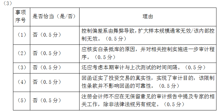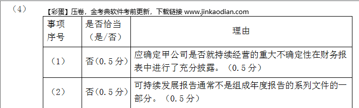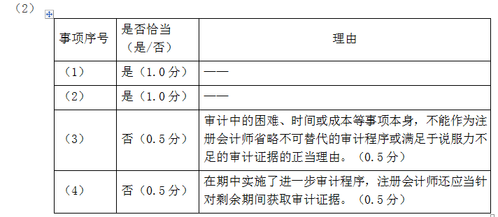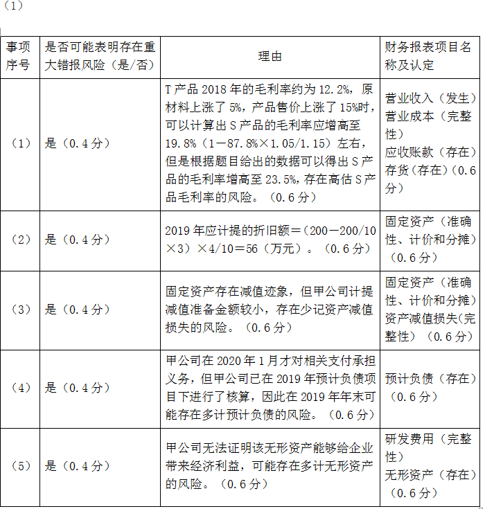 问题 上市公司甲公司是ABC会计师事务所的常年审计客户,主要从事汽车零备件的生产和销售。A注册会计师负责审计甲公司2019年度财务报表。 资料一: A注册会计师在审计工作底稿中记录了所了解的甲公司情况及其环境,部分内容摘录如下: (1)甲公司于2019年初完成了对主要产品T的更新换代,升级后的S产品由于其性能良好,在市场上很受欢迎。甲公司自2019年2月起大幅减少了T产品的生产。S产品所需原材料与T产品基本相同,2019年原材料平均价格较2018年上涨了约5%,S产品的平均售价比T产品高约15%。 (2)甲公司于2016年1月1日起对一台管理用的机器设备X计提折旧,原价为200万元,预计使用年限为10年(不考虑净残值因素),按直线法计提折旧。由于技术进步的原因,从2019年1月1日起,决定对原估计的使用年限改为7年,同时改按年数总和法计提折旧。 (3)2019年末,甲公司Y生产线的市价在当期大幅度下跌,跌幅明显高于因时间推移或正常使用而预计的下跌。 (4)甲公司生产过程中产生的噪音和排放的气体对环境造成一定影响。尽管周围居民要求给予补偿,但甲公司考虑到现行法律并没有相关规定,以前并未对此作出回应。为改善与周围居民的关系,甲公司董事会于2019年12月26日决定对居民给予总额为100万元的一次性补偿,并制定了具体的补偿方案。2020年1月15日,甲公司向居民公布了上述补偿决定和具体补偿方案。 (5)甲公司自2018年起研发一项新产品技术,于2019年12月末完成技术开发工作,并确认无形资产200万元。甲公司拟将其出售,因受国家产业政策的影响,市场对该类新产品尚无需求。 资料二: A注册会计师在审计工作底稿中记录了甲公司的财务数据,部分内容摘录如下: 金额单位:万元 资料三: A注册会计师在审计工作底稿中记录了审计计划,部分内容摘录如下: (1)A注册会计师在对应收账款进行审计时,拟采用选取特定项目的方法将应收账款中金额超过实际执行的重要性的项目挑选出来单独测试,再针对剩余的应收账款项目进行抽样。 (2)A注册会计师认为仅实施实质性程序不能获取与营业收入相关的充分、适当的审计证据,因此拟对与营业收入相关的内部控制执行控制测试。 (3)甲公司地处东北,积雪严重,部分露天存放的存货被积雪覆盖,考虑到天寒地冻,监盘不便,A注册会计师不对这部分存货实施监盘,拟执行替代审计程序。 (4)在对甲公司的成本核算进行审计时,A注册会计师在期中获取的证据满意且成本核算不存在特别风险,拟针对剩余期间不实施审计程序。 资料四: A注册会计师在审计工作底稿中记录了实施进一步审计程序的情况,部分内容摘录如下: (1)A注册会计师在测试与生产与存货相关的内部控制时发现一项控制偏差,经查证系员工舞弊导致。A注册会计师追加样本进行测试后未再识别出偏差,故认为相关内部控制运行有效。 (2)A注册会计师对甲公司的库存现金进行了突击监盘,发现存在白条抵库情况。因白条金额较小,A注册会计师未要求管理层更正,也未再实施其他审计程序。 (3)A注册会计师拟信赖关于采购交易的内部控制,该内部控制自上次测试后未发生变化,且不属于旨在减轻特别风险的控制,A注册会计师拟直接利用以前审计获取的审计证据,不在本期进行控制测试。 (4)A注册会计师针对甲公司某项投资交易进行了函证,目的是证实该投资是否真实存在。A注册会计师收到了回函,但是附有限制性条款“因采用公允价值模式计量,该投资的价值系估计金额,不保证金额完全准确”。A注册会计师认为该限制性条款影响回函的可靠性,故不拟信赖回函的内容。 (5)A注册会计师在审计过程中利用了专家的工作,并在无保留意见的审计报告中提及专家的工作,同时指明这种提及不减轻注册会计师对审计意见承担的责任。 资料五: A注册会计师在审计工作底稿中记录了重大事项的处理情况,部分内容摘录如下: (1)2019年12月,甲公司管理层发生了重大决策失误,预计会对2020年及以后的销售工作产生重大不利影响。A注册会计师认为甲公司的持续经营存在重大不确定性,拟在审计报告中增加以“与持续经营相关的重大不确定性”为标题的单独部分。 (2)2020年2月1日,甲公司的可持续发展报告还未完成,A注册会计师认为组成年度报告的文件在审计报告日后才能取得,要求管理层提供书面声明,声明该文件的最终版本将在可获取时并且在被审计单位公布前提供给A注册会计师,以使其可以完成准则要求的程序。 (1)针对资料一第(1)至(5)项,结合资料二,假定不考虑其他条件,逐项指出资料一所列事项是否可能表明存在重大错报风险。如果认为可能表明存在重大错报风险,简要说明理由,并说明该风险主要与哪些财务报表项目的哪些认定相关(不考虑税务影响)。将答案直接填入答题区的相应表格内。 (2)针对资料三第(1)至(4)项,假定不考虑其他条件,逐项指出审计计划的内容是否恰当。如不恰当,简要说明理由。将答案直接填入答题区的相应表格内。 (3)针对资料四第(1)至(5)项,假定不考虑其他条件,逐项指出A注册会计师的做法是否恰当。如不恰当,简要说明理由。将答案直接填入答题区的相应表格内。 (4)针对资料五第(1)至(2)项,假定不考虑其他条件,逐项指出A注册会计师的做法是否恰当。如不恰当,简要说明理由。将答案直接填入答题区的相应表格内。