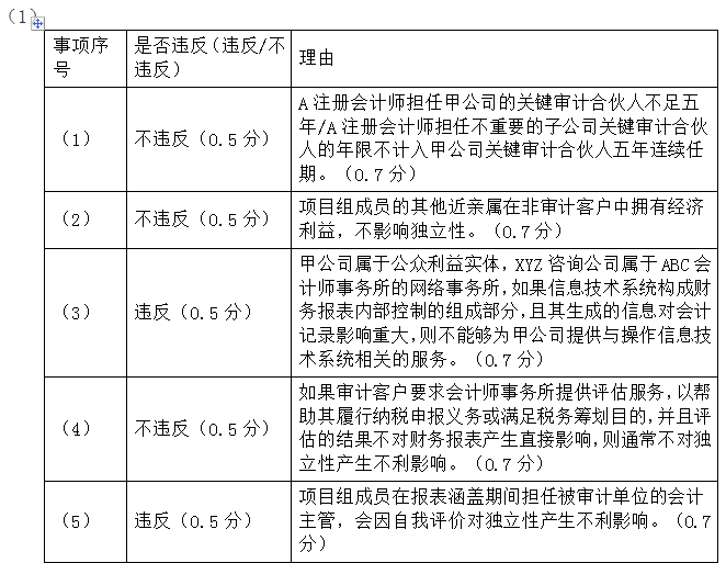问题 上市公司甲公司系ABC会计师事务所的常年审计客户,A注册会计师负责审计甲公司2019年的财务报表。审计过程中存在下列事项: (1)A注册会计师曾担任甲公司的不重要的子公司2014年至2017年的财务报表审计的项目合伙人。ABC会计师事务所委派A注册会计师担任甲公司2019年财务报表审计的项目合伙人。已知A注册会计师于2018年未参与任何项目的审计业务。 (2)丙公司是甲公司的不重要的联营企业,项目组成员B的姐姐在丙公司拥有重大经济利益。已知丙不是ABC会计师事务所的审计客户。 (3)XYZ咨询公司是ABC会计师事务所的网络事务所,为甲公司提供与操作信息技术系统相关的服务,该信息技术系统构成财务报告内部控制的重要组成部分,且其生成的信息对会计记录影响重大。 (4)ABC会计师事务所应甲公司要求为其提供评估服务,以帮助其履行纳税申报义务,评估的结果不对财务报表产生直接影响。 (5)审计项目组成员C曾在甲公司担任会计主管,于2019年1月20日离开甲公司,加入ABC会计师事务所。 (1)要求:针对上述第(1)至(5)项,逐项指出是否可能存在违反中国注册会计师职业道德守则有关独立性规定的情况,并简要说明理由。将答案直接填入答题区相应的表格内。