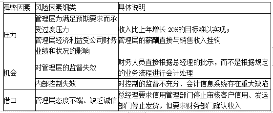 问题 在了解X公司及其环境、评估重大的错报风险时,A注册会计师发现X公司2019年度主要发生了下列事项:   X公司2018年实现的收入为12000万元。董事会制定的2019年度目标年度总收入比2018年上升20%。总经理的薪酬根据收入实现情况确定。   2019年12月14日,X公司总经理调阅了财务部门提供的全年销售收入资料,获悉至当日为止当年已累计取得12075万元的营业收入。从12月15日开始,总经理亲自参与销售部门的工作,并以诱人的优惠赊销条款吸引新、老客户于2019年底之前签订赊销合同。部分客户受优惠条件的吸引,已提前签订了销售合同。  对于12月中旬以后发生的赊销业务,信用管理部门根据总经理的要求,不进行信用审查;发运部门根据总经理的批示,不发出产成品;开具销售发票及记录销售的财务人员根据总经理的批示,直接根据销售单开出销售发票并登记入账。   要求:针对资料中的舞弊情况及涉及的财务报表项目,结合舞弊因素的细类进行说明,并将答案填入下表中。