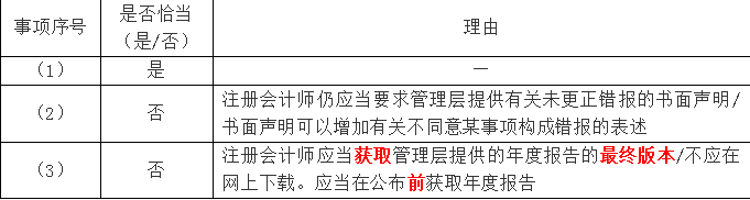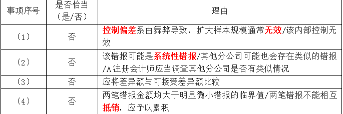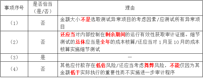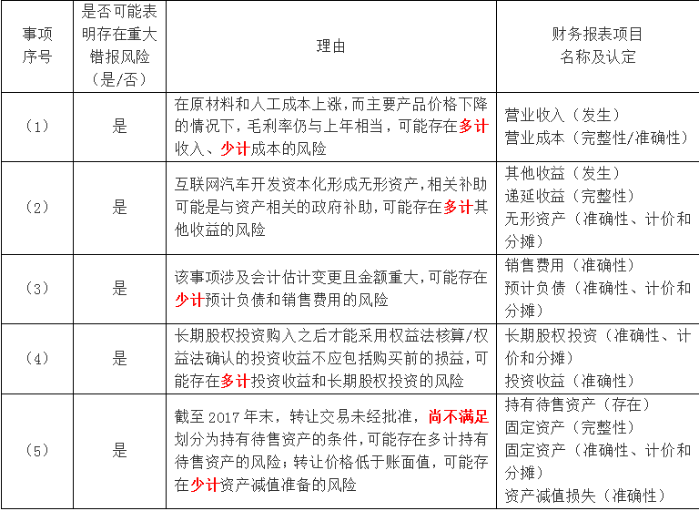 问题 上市公司甲公司是ABC会计师事务所的常年审计客户,主要从事汽车的生产和销售。A注册会计师负责审计甲公司2017年度财务报表,确定财务报表整体的重要性为1000万元,明显微小错报的临界值为30万元。 资料一: A注册会计师在审计工作底稿中记录了所了解的甲公司情况及其环境,部分内容摘录如下: (1)2017年,在钢材价格及劳动力成本大幅上涨的情况下,甲公司通过调低主打车型的价格,保持了良好的竞争力和市场占有率。 (2)2017年,甲公司首款互联网汽车研发项目取得突破性进展,于2017年末开始量产。甲公司因此获得研发补助1800万元,并于2017年12月将相关开发支出转入无形资产。 (3)自2017年1月起,甲公司将产品质量保证金的计提比例由营业收入的3%调整为2%。 (4)2017年12月31日,甲公司以1亿元购入丙公司40%股权。根据约定,甲公司按持股比例享有丙公司自评估基准日2017年6月30日至购买日的净利润。 (5)2017年12月,甲公司与非关联方丁公司签订意向书,以3000万元价格向其转让一批旧设备。2018年1月,该交易获得批准并完成交付。 资料二: A注册会计师在审计工作底稿中记录了甲公司的财务数据,部分内容摘录如下: ? ? ? ? ? ? ? ? ? ? ? ? ? ? ? ? ? ? ?金额单位:万元 要求: (1)针对资料一第(1)至(5)项,结合资料二,假定不考虑其他条件,逐项指出资料一所列事项是否可能表明存在重大错报风险。如果认为可能表明存在重大错报风险,简要说明理由,并说明该风险主要与哪些财务报表项目的哪些认定相关(不考虑税务影响)。 资料三: A注册会计师在审计工作底稿中记录了审计计划,部分内容摘录如下: (1)因评估的舞弊风险较高,A注册会计师拟将甲公司全年的会计分录和其他调整作为会计分录测试的总体,针对该总体实施完整性测试,并选取所有金额超过30万元的异常项目进行测试。 (2)A注册会计师认为仅实施实质性程序不能获取与成本核算相关的充分、适当的审计证据,因此,拟实施综合性方案:测试相关内部控制在2017年1月至10月期间的运行有效性,并对2017年11月至12月的成本核算实施细节测试。 (3)A注册会计师在询问管理层、阅读内控手册并执行穿行测试后,尽管认为甲公司与关联方交易相关的内部控制设计合理,但不拟信赖,拟直接实施细节测试。 (4)因其他应收款和其他应付款的年初年末余额均低于实际执行的重要性,A注册会计师拟不对其实施进一步审计程序。 要求: (2)针对资料三第(1)至(4)项,假定不考虑其他条件,逐项指出A注册会计师的做法是否恰当。如不恰当,简要说明理由。 资料四: A注册会计师在审计工作底稿中记录了实施进一步审计程序的情况,部分内容摘录如下: (1)A注册会计师在测试与销售收款相关的内部控制时识别出一项偏差,经查系员工舞弊所致。因追加样本量进行测试后未再识别出偏差,A注册会计师认为相关内部控制运行有效,并向管理层通报了该项舞弊。 (2)A注册会计师选取甲公司的部分分公司实施库存现金监盘,发现某分公司存在以报销凭证冲抵现金的情况。因错报金额低于明显微小错报的临界值,A注册会计师未再实施其他审计程序。 (3)A注册会计师采用实质性分析程序测试甲公司2017年度的运输费用,已记录金额低于预期值500万元,因该差异低于实际执行的重要性,A注册会计师认可了已记录金额。 (4)A注册会计师在测试管理费用及研发费用时发现两笔错报,分别为少计会议费40万元和多计研发支出50万元,因合计金额小于明显微小错报的临界值,未予累积。 要求: (3)针对资料四第(1)至(4)项,假定不考虑其他条件,逐项指出A注册会计师的做法是否恰当。如不恰当,简要说明理由。 资料五: A注册会计师在审计工作底稿中记录了重大事项的处理情况,部分内容摘录如下: (1)2018年1月初,甲公司对某型号汽车实施召回,免费更换安全气囊,预计将发生更换费用4000万元。管理层在2017年度财务报表中确认了该项费用并进行了披露。A注册会计师在对更换费用及相关披露实施审计程序后,认可了管理层的处理。 (2)因不同意A注册会计师提出的某些审计调整建议,管理层拒绝在书面声明中说明未更正错报单独或汇总起来对财务报表整体的影响不重大。考虑到未更正错报对财务报表的影响很小,A注册会计师同意管理层不提供该项声明。 (3)因未能在审计报告日前获取甲公司2017年年度报告,A注册会计师于审计报告日后从网上下载了甲公司公布的年度报告进行阅读,结果满意。 要求: (4)针对资料五第(1)至(3)项,假定不考虑其他条件,逐项指出A注册会计师的做法是否恰当。如不恰当,简要说明理由。