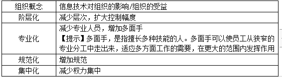 解析 信息技术对组织的影响: 通过组建虚拟企业,一个企业可以突破自身能力的限制,追求一种完全靠自身资源或能力难以达到的目标。这种结构的优点在于灵活性强,有利于很快地重组社会的资源适应市场的需要。因此,选项A、B、C、D均正确。