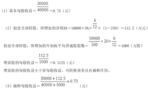 问题 某上市公司2019年7月1日按面值发行年利率3%的可转换公司债券,面值10 000万元,期限为5年,利息每年末支付一次,发行结束一年后可以转换股票,转换价格为每股5元,即每100元债券可转换为1元面值的普通股20股。2019年该公司归属于普通股股东的净利润为30000万元,2019年发行在外的普通股加权平均数为40 000万股,债券利息不符合资本化条件,直接计入当期损益,所得税税率25%。假设不考虑可转换公司债券在负债成份和权益成份之间的分拆,且债券票面利率等于实际利率。计算下列指标:   (1)基本每股收益;(2)计算增量股的每股收益,判断是否具有稀释性;(3)稀释每股收益。