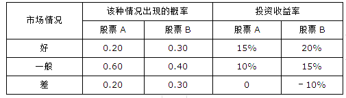 解析 1.股票A的期望收益率=0.2×15%+0.6×10%+0.2×0=9%(0.5分) 股票B的期望收益率=0.3×20%+0.4×15%+0.3×(-10%)=9%(0.5分) 股票A的方差=0.2×(0.15-0.09) 2 +0.6×(0.10-0.09) 2 +0.2×(0-0.09) 2 =0.0024(0.5分) 股票A的标准差=(0.0024) 1/2 =4.90%(0.5分) 股票B的方差=0.3×(0.20-0.09) 2 +0.4×(0.15-0.09) 2 +0.3×(-0.10-0.09) 2 =0.0159(0.5分) 股票B的标准差=(0.0159) 1/2 =12.61%(0.5分) 2.股票A的标准离差率=4.90%/9%×100%=54.44%(0.5分) 股票B的标准离差率=12.61%/9%×100%=140%(0.5分) 由于股票B的标准离差率大于股票A的标准离差率,所以股票B的相对风险更大。(1分)