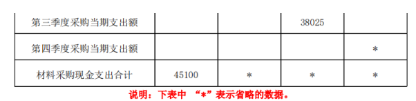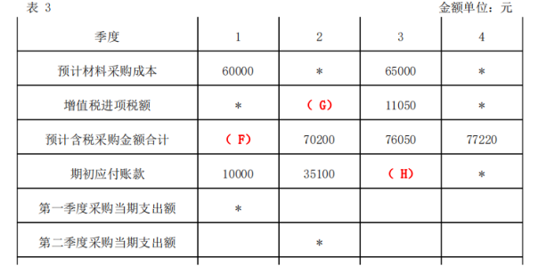 解析 ( 1) A=70200(元); B=117000(元); C=70200(元); D=18700(元); E=77220(元) ( 2)应收账款年末余额= 128700×40%= 51480(元) ( 3) F=70200(元); G=10200(元); H=35100(元) ( 4)应付账款年末余额= 77220×50%= 38610(元) 【解析】 ( 1) A=第一季度销售当期收现额 =117000× 60%=70200(元) B= 第二季度预计含税销售收入 =100000+17000=117000(元) C= 第二季度销售当期收现收入 =117000× 60%=70200(元) D= 第三季度增值税销项税额 =110000× 17%=18700(元) E= 第四季度销售当期收现额 =128700× 60%=77220(元) ( 3) F=预计含税采购金额 =预计材料采购成本 +增值税进项税额 =60000+60000×17%=70200(元) G= 第二季度增值税进项税额 =[预计含税采购金额 /( 1+17%) ]×17%=[70200/( 1+17%) ]×17%=10200(元) H= 第三季度期初应付账款 =第二季度预计含税采购金额 ×赊购率 =70200×50%=35100(元)。