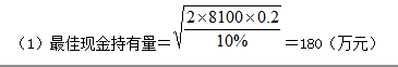 解析 (2)最佳现金持有量下现金转换次数=8100/180=45(次)   (3)最佳现金持有量下现金交易成本=45×0.2=9(万元)   (4)最佳现金持有量下持有现金的机会成本=180/2×10%=9(万元) {图1} 或者:最佳现金持有量下的相关总成本=180×10%=18(万元)   或者:最佳现金持有量下的相关总成本=9+9=18(万元)