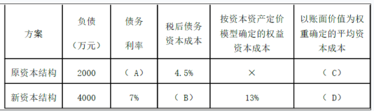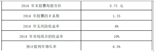 解析 ( 1)必要收益率 =4%+1.25×( 10%-4%) =11.5%。 ( 2)股票内在价值 =0.5/( 11.5%-6.5%) =10(元)。 ( 3)由于股票内在价值 10元高于股票市价 8.75元,所以,投资者 2014年末应该以当时的市场价格买入乙公司股票。 ( 4) A=4.5%/( 1-25%) =6% B=7% ×( 1-25%) =5.25% C=4.5% ×( 2000/10000) +11.5%×( 8000/10000) =10.1% D=5.25% ×( 4000/10000) +13%×( 6000/10000) =9.9%。 ( 5)新资本结构更优,因为新资本结构下的平均资本成本更低。 ( 6) 2015年的利息 =4000× 7%=280(万元) 2016 年财务杠杆系数( DFL) =2015年息税前利润 /( 2015年息税前利润 -2015年利息)=1400/( 1400-280) =1.25 2016 年总杠杆系数( DTL) =经营杠杆系数×财务杠杆系数 =2× 1.25=2.5。