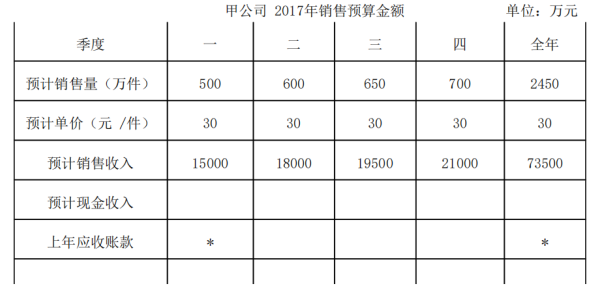 (2017年)甲公司编制销售预算的相关资料如下:资料一: 甲公司预计每季度销售收入中,有 70%在本季度收到现金, 30%于下一季度收到现金,不存在坏...