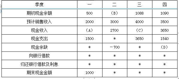 解析 (1)2018年末预计应收账款=3500×30%=1050(万元)   (2)A=2000×70%=1400(万元)   B=1000(万元)   C=3000×30%+4000×70%=3700(万元)   D=1090+3650-1540=3200(万元)