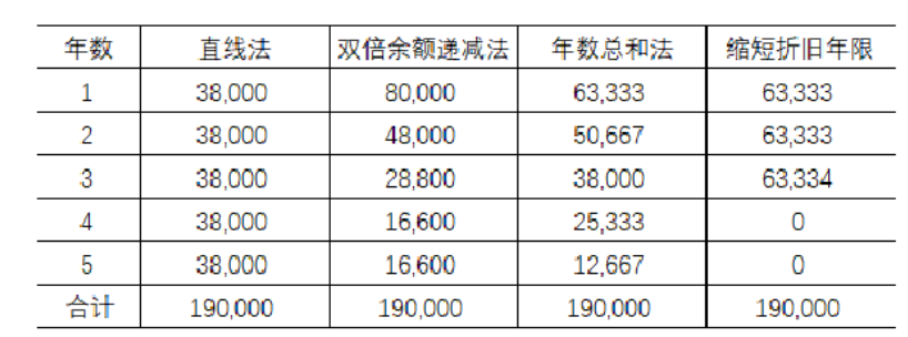 解析 』『提示1』直线法每年折旧额: 200000×(1-5%)/5=38000(元)   『提示2』双倍余额递减法,其折旧率为1/5×2=40%;   第一年折旧:200000×40%=80000(元)   第二年折旧:(200000-80000) ×40%=48000(元)   第三年折旧:(200000-80000-48000)×40%=28800(元)   第四、五年:(200000-80000-48000-28800-200000×5%)/2=16600(元)   『提示3』年数总和法:   其折旧基数为:200000×(1-5%)=190000(元)   五年的年数总和为5+4+3+2+1=15(年);   1~5年的折旧率分别为:5/15;4/15;3/15;2/15;1/15。   各年折旧用折旧基数乘以折旧率得到。   『提示4』缩短折旧年限为3年:   直线法每年折旧额: 200000×(1-5%)/3=63333(元) 采用缩短折旧年限法可以获得更多净现值,从而企业价值最大化