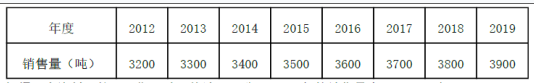 问题 某公司 2012~ 2019年的产品销售量资料如下表: 根据以上资料,按照 3期移动平均法预测公司 2020年的销售量为(  )吨。
