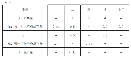 问题 戊公司只生产销售甲产品,该产品全年产销量一致。 2019年固定成本总额为4800万元,该产品生产资料如表 2所示: 表 2 2019 年甲产品生产和销售资料 单位:万台 经过公司管理层讨论,公司 2020年目标利润总额为 600万元(不考虑所得税)。假设甲产品单价和成本性态不变。为了实现利润目标,根据销售预测,对甲产品 2020年四个季度的销售量做出如下预计,见表 3。 若每季度末预计的产成品存货占下个季度预计销售量的 10%, 2020年年末预计的产成品存货数为 0.2万台。各季预计的期初存货为上季末期末存货。根据以上资料,戊公司生产预算如表 4所示: 表中 *表示省略的数据。 要求: ( 1)计算甲产品 2019年的边际贡献总额和边际贡献率; ( 2)计算甲产品 2019年保本销售量和保本销售额; ( 3)计算甲产品 2019年的安全边际量和安全边际率,并根据投资企业经营安全程度的一般标准,判断公司经营安全与否; ( 4)计算 2020年实现目标利润总额 600万元的销售量。 ( 5)确定表 4中英文字母代表的数值(不需要列示计算过程)。