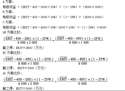 解析 『决策』  当EBIT<2600万元时,应选择A方案筹资   当2600<EBIT<3300万元时,应选择B方案筹资   当EBIT>3300万元时,应选择C方案筹资
