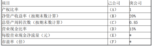 选项 A、B、C、D、E、F所代表的数值(不需要列示计算过程)。   (2)根据要求(1)的计算结果和资料三,回答下列问题:①判断己公司和庚公司谁的财务结构更加稳健,并说明理由;②判断己公司和庚公司获取现金的能力哪个更强,并说明理由。   (3)根据资料二,计算并回答下列问题:①运用资本资产定价模型计算己公司股票的必要收益率;②计算己公司股票的价值;③给出“增持”或“减持”该股票的投资建议,并说明理由。   (4)根据资料四,计算并回答下列问题:①计算庚公司股票的内部收益率;②给出“增持”或“减持”该股票的投资