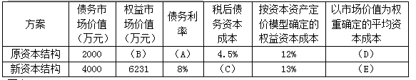 解析 (1)A=4.5%/(1-25%)=6% B=(1400-2000×6%)×(1-25%)/12%=8000(万元) C=8%×(1-25%)=6% D=4.5%×(2000/10000)+12%×(8000/10000)=10.5% E=6%×(4000/10231)+13%×(6231/10231)=10.26% (2)新资本结构更优,因为新资本结构下的加权平均资本成本更低。 (3)2020年的税前利润=1400-4000×8%=1080(万元) 2021年财务杠杆系数(DFL)=2020年息税前利润/2020年税前利润=1400/1080=1.30 2021年经营杠杆系数(DOL)=总杠杆系数/财务杠杆系数=2.6/1.30=2。