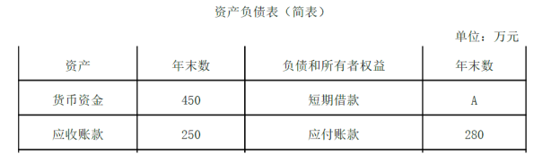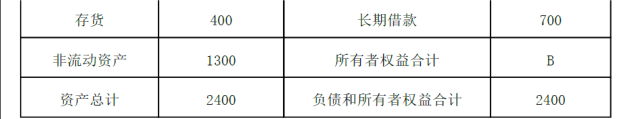 问题 丁公司 2017年末的资产负债表(简表)如下。 2017 年营业收入为 1650万元,营业成本为 990万元,净利润为 220万元,应收账款年初余额为 150万元,存货年初余额为 260万元,所有者权益年初余额为 1000万元。该公司年末流动比率为 2.2。 要求: ( 1)计算上表中字母 A和 B所代表的项目金额。 ( 2)每年按 360天计算,计算应收账款周转次数、存货周转天数和营业毛利率。