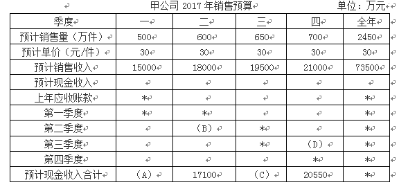 甲公司编制销售预算的相关资料如下:资料一:甲公司预计每季度销售收入中,有70%在本季度收到现金,30%于下一季度收到现金,不存在坏账。2016年末应收...