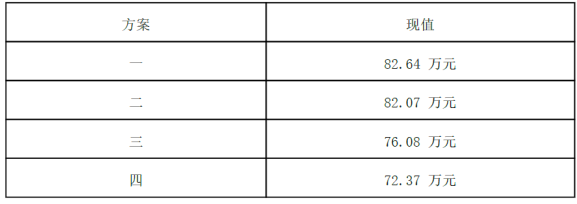 解析 ( 1)方案一 复利现值 =复利终值×复利现值系数 =100×( P/F, 10%, 2) =100× 0.8264=82.64(万元) ( 2)方案二 现值 =30×( P/A, 10%, 2) +30=30× 1.7355+30=82.07(万元) 或 : 现值 =30×( P/A, 10%, 3)×( 1+10%) =30× 2.4869× 1.1=82.07(万元) ( 3)方案三 现值 =24×( P/A, 10%, 4) =24× 3.1699=76.08(万元) ( 4)方案四 现值 =21×( P/A, 10%, 5)×( P/F, 10%, 1) =21× 3.7908× 0.9091=72.37(万元) ( 5)因为方案四的现值最小,所以甲公司应选择方案四的付款方案。