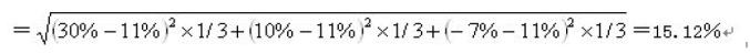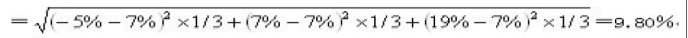 解析 1.A资产的预期收益率=1/3×30%+1/3×10%+1/3×(-7%)=11% B资产的预期收益率=1/3×(-5%)+1/3×7%+1/3×19%=7% 资产组合的预期收益率=11%×50%+7%×50%=9%(1分) 2.A 资产收益率的标准差 B资产收益率的标准差 3.资产组合收益率的方差 =(0.5×15.12%) 2+(0.5×9.80%) 2+2×(-1)×(0.5×15.12%)×(0.5×9.80%) =(0.5×15.12%-0.5×9.80%) 2 =0.071%(1分) 资产组合收益率的标准差=(0.071%) 1/2=|0.5×15.12%-0.5×9.80%|=2.66%(1分)