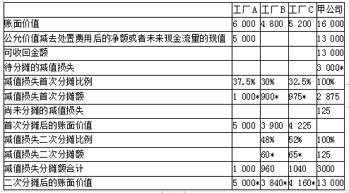 解析 1.甲公司应将工厂ABC认定为一个资产组。因为工厂ABC组成一个独立的产销单元,能够产生独立的现金流量,工厂A生产的半成品全部发往B、C工厂组装,并不直接对外出售,且需在B、C工厂之间根据市场需求的地区分布和B、C工厂的装配能力进行分配。 2. 3. 借:资产减值损失 3 000     贷:固定资产减值准备——A   1 000    ——B    960    ——C   1 040