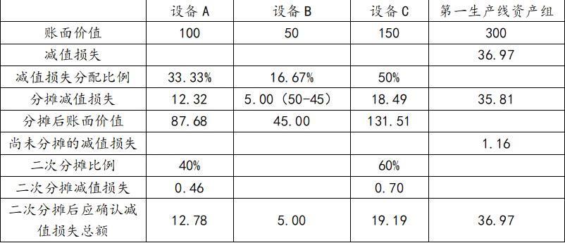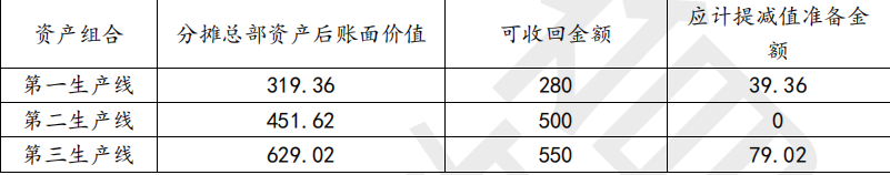 解析 首先要将总部资产采用合理的方法分配至各资产组,然后比较各资产组的可收回金额与账面价值,最后将各资产组的资产减值额在总部资产和各资产组之间分配。 (1)将总部资产分配至各资产组 总部资产的账面价值,应当首先根据各资产组的账面价值和剩余使用寿命加权平均计算的账面价值分摊比例进行分摊。 (2)将分摊总部资产后的各资产组账面价值与其可收回金额进行比较,确定应计提减值准备的金额,如下表: (3)将各资产组的减值额在总部资产和各资产组之间分配 第一生产线减值额分配给总部资产的数额=39.36×(19.36/319.36)=2.39(万元) 分配给第一生产线本身的数额=39.36×(300/319.36)=36.97(万元) 第三生产线减值额分配给总部资产的数额=79.02×(129.02/629.02)=16.21(万元) 分配给第三生产线本身的数额=79.02×(500/629.02)=62.81(万元) 总部资产应计提减值准备的金额=2.39+16.21=18.6(万元) (4)将第一生产线的损失分配至每个具体设备 单位:万元
