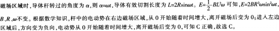 问题 如图所示,纸平面内两个半径均为R的半圆相切于0点.半圆形区域内分别存在垂直纸面的匀强磁场,磁感应强度大小相等、方向相反.一长为2R的导体杆OA绕过0点且垂直于纸面的轴顺时针匀速旋转,t=0时.OA恰好位于两半圆的公切线上。若选取从0指向A的方向为电动势的正方向,下列描述导体杆中感应电动势随时间t变化的图象正确的是( )。