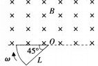 问题 如图所示的区域内有垂直于纸面的匀强磁场,磁感应强度为B。电阻为R、半径为L、圆心角为450的扇形闭合导线框绕垂直于纸面的0轴以角速度w匀速转动(O轴位于磁场边界)。则线框内产生的感应电流的有效值为( )。