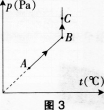 问题 一定质量的理想气体经历了A→B→C变化过程,其压强随温度变化的p-t图如图3所 示。气体在A、B、C三个状态时的体积分别为VA、VB、VC。则通过图象可以判断( )。