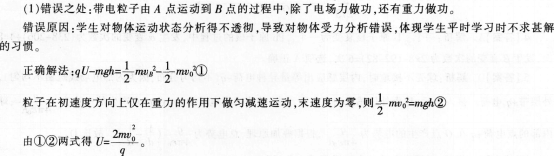 问题 案例: 某教师为了检测学生对电场力做功、电势差等知识的掌握情况,布置了若干练习题,下面是某同学对其中一题的解答过程: 题目:如图所示,质量为m的带电粒子,其带电量为q,以初速度v0从A点竖直向上射入真空中的匀强电场中。若电场方向水平向右,粒子通过电场中的B点时,速率vB=2v0,方向与电场方向一致。试求