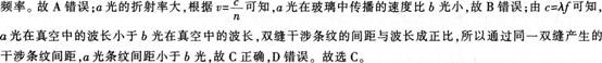 选项 A.a光的频率小于b光的频率 B.a光在玻璃中的传播速度大于b光在玻璃中的传播速度 C.通过同一双缝产生的干涉条纹间距,a光条纹间距小于b光条纹间距 D.a光在真空中的波长等于b光在真空中的波长