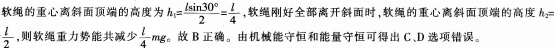 选项 A.物块机械能逐渐增加 B.软绳重力势能减少1/4mgl C.物块重力势能的减少等于软绳克服摩擦力所做的功 D.软绳机械能的减少等于其克服摩擦力所做的功