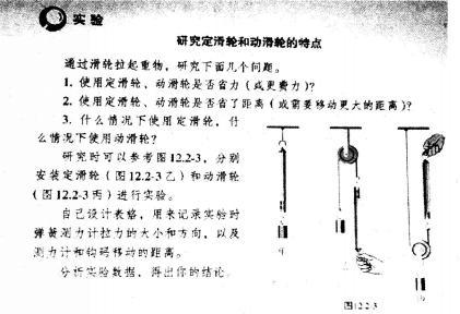 解析 (1)使用定滑轮不省力,但可以改变力的方向;使用动滑轮可以省力,但不改变力的方向,且费距离。 (2)针对图12.2—3,请学生观察,看两种方法提升钩码时有哪些不同 在比较轴是否移动的基础上总结出定滑轮和动滑轮的定义。 思考:我们知道力有三要素,就是力的大小、方向和作用点。定滑轮能改变力的方向。是否能改变力的大小 动滑轮不能改变用力的方向,能否改变力的大小 下面通过实验进行探究。 请同学们结合实验,思考以下问题: ①使用定滑轮的好处是什么 ②使用定滑轮可以省力吗 ③使用定滑轮可以省动力作用点移动的距离吗 总结:使用定滑轮不省力,不省距离;但可以改变力的方向。请同学们结合实验,思考以下问题: ①使用动滑轮能改变动力的方向吗 ②使用动滑轮可以省力吗 ③使用动滑轮可以省动力作用点移动的距离吗 总结:使用动滑轮可以省力。但费距离,且不改变力的方向。
