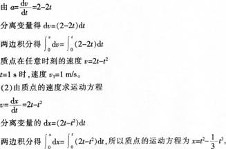 问题 一质点作直线运动,已知其加速度a=2-2t,初始条件为xo=0,υo=0。 (1)质点在第1秒末的速度; (2)质点的运动方程; (3)质点在前3秒内运动的路程。