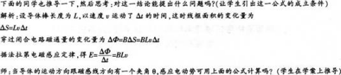 解析 (1)法拉第电磁感应定律:闭合电路中感应电动势的大小,跟穿过这一电路的磁通量的变化率成正比。 (2)教学设计如下: 一、教学目标 (一)知识与技能 1.知道什么叫感应电动势,知道电路中哪部分相当于电源 2.知道磁通量的变化率是表示磁通量变化快慢的物理量。 3.理解法拉第电磁感应定律的内容、数学表达式。 4.能推导出E=B1vsinθ。 (二)过程与方法 1.经历实验过程,培养动手能力和探究能力。 2.通过推导导线切割磁感线时的感应电动势公式E=B1v,掌握运用理论知识探究问题的方法。 (三)情感、态度与价值观 了解法拉第探索科学的方法,学习他的执著的科学探究精神。 二、教学重点 让学生探究影响感应电动势的因素,并能定性地找出感应电动势与磁通量的变化率的关系。 会推导导线切割磁感线时的感应电动势的表达式。 三、教学难点 如何设计探究实验定性研究感应电动势与磁通量的变化率之间的关系。 四、教学用具 多媒体电脑、PPT课件、探究实验器材(线圈、蹄形磁铁、导线、电流计等)。 五、教学过程 引入新课 师:在物理学史上,有这样一位科学家,他是一个贫穷的铁匠的儿子,做过订书学徒,干过非常卑贱的工作. 但却取得了非凡的成就。他用一个线圈和一个磁铁,改变了整个世界。今天,从美国的阿拉斯加到中国的青藏高原,从北极附近的格陵兰岛,到南极考察站,都离不开他一百多年前的发现,这位科学家是谁 ——英国科学家法拉第。 下面大家各小组再重新做一下这一有着划时代意义的实验:(学生做实验) 在学生组装实验器材做实验的同时,教师进行巡视,指导。学生可能出现的情况: 组装器材缓慢,接触不好,现象不明显等。教师加以必要的指导。 师:同学们,我们用一个线圈和一个磁铁竟然使闭合电路中产生了电流,这是多么令人惊奇的发现!根据电路的知识,在这个实验电路中哪一部分相当于电源呢 (学生回答) 师:如果你是法拉第.当你发现了电磁感应现象以后,下一步你要进一步研究什么呢 (学生回答) 好,下面我们就来探究一下影响感应电动势的因素。现在大家猜想一下:感应电动势可能由什么因素决定 小组讨论一下。(学生讨论) (可让学生自由回答)情况预测:线圈的大小、匝数、磁通量的大小、磁通量变化的大小、时间、磁通量的变化 率、磁感应强度等等…… 师:大家猜想的都有可能。我们知道产生感应电流的条件是磁通 量要变化.那么是不是就意味着感应电动势和磁通量的变化有关,与 变化时间有关呢 下面我们就来探究一下感应电动势E与磁通量的 变化△φ和变化时间△t有什么定性关系。 研究三个变量之间的关系.我们采用什么方法 (生答:控制变量法)黑板上板书: △φ一定.△t增大.则E △t一定.△φ增大.则E 师:好.现在就请各组的同学按照学案上的提示,看能不能设计试 验来探究一下。 在这里教师要在巡回中加以指导。对学生的设计方案进行必要修改和纠正。可先让学生说一下实验方案。 (注意图中两个电表是电流计) 学生试验完成后,让学生在黑板上填上结论。 精确的定量实验得出:电路中感应电动势的大小,跟穿过这一电路的磁通量的变化率成正比,这就是法拉第电磁感应定律。 实际上.上式只是单匝线圈所产生的感应电动势的表达式,如果是n匝线圈,那么表达式应该是怎样的 为什么 可以从理论上得出吗 导线切割磁感线时的感应电动势: 在初中时我们就已经知道,导线切割磁感线会产生感应电流,今天我们就来推导一下导线切割磁感线时的感应电动势。谁能自告奋勇到黑板上推导一下 注意结论应为:E=Bιυcosθ