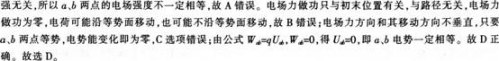 一个点电荷从静电场中的a点移到b点,其电势能的变化为零,则(  )。A.a、b两点的场强一定相等 B.该点电荷一定沿等势面移动 C.作用于该点电荷的电...