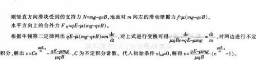 问题 如图所示,水平地面上方有垂直于纸面向里的匀强磁场B,水平向右的匀强电场E。一质量为m,带正电荷q的滑块在水平地面上做直线运动。滑块与地面间的动摩擦因数为μ,且qE>μmg。则滑块未脱离地面前的速度υ等于多少