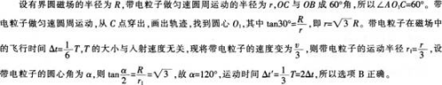 问题 如图所示,圆形区域内有垂直于纸面向里的匀强磁场,一个带电粒子以速度υ从A点沿直径AOB方向射人磁场,经过△t时间从C点射出磁场,OC与OB成60。角。现将带电 变为(  )。
