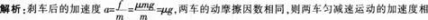 问题 一辆空车和一辆满载货物的同型号汽车,在同一路面上以相同的速度向同一方向行驶。两辆汽车同时紧急刹车后(即车轮不滚动只滑动),以下说法正确的是(  )。