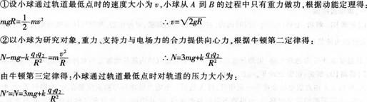 问题 阅读案例,并回答问题。 下面是某同学对课后习题的解答过程: 如图所示,正电荷q1固定于半径为R的半圆光滑轨道的圆心处,将另一带正电、电荷量为q2、质量为m的小球,从轨道的A处无初速度释放,求: (1)小球运动到B点时的速度大小;(2)小球在B点时对轨道的压力。 解:(1)设小球通过轨道最低点时的速度大小为υ,小球从A到B的过程中只有重力做功,根据动能定理得: 问题:(1)指出学生解答中的错误,分析错误产生的可能原因,给出正确解法。 (2)给出一个教学思路,帮助学生掌握相关知识。