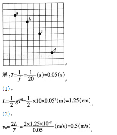 下面是一道作业题及某同学的解答。 题目:如图所示为小球平抛运动的频闪照片,闪光频率为f=20 Hz,求实验频闪照片背景上每小方格边长L以及小球平抛的初速...