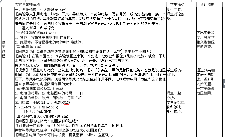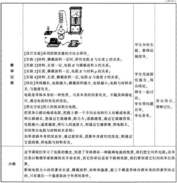 解析 (1)同种材料的导体,其电阻R与它的长度l成正比,与它的横截面积S成反比:导体电阻还与构成它的材料有关.用公式表示 (2)教学设计如下: