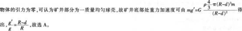 假设地球是一半径为R、质量分布均匀的球体。一矿井深度为d。已知质量分布均匀的球壳对壳内物体的引力为零。矿井底部和地面处的重力加速度大小之比为(  )。