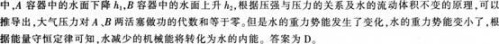 问题 如图所示,容器A、B各有一个可以自由移动的轻活塞,活塞下面是水,上面是大气,大气压恒定。A、B的底部由带有阀门K的管道相连,整个装置与外界绝热。原先A中水面比B中水面高,打开阀门K后,A中的水向B中流,最后达到平衡,这个过程中(  )。