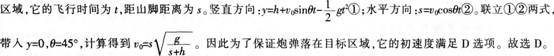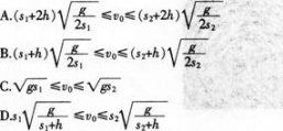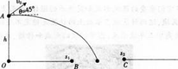 问题 某部队在山顶上进行炮弹射击训练,如图所示,炮台距地面高度AO为h,炮弹射击方向与水平面成45°。水平地面上有一目标区域,它的左端距0点的距离BO为s1,右端距0点的距离C0为s2。为了保证炮弹击中目标区域,炮弹初速度υo。应满足什么条件 (  )