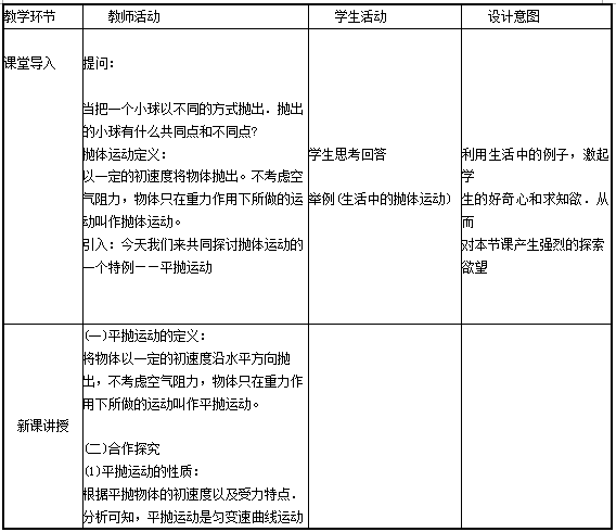 解析 (1)研究抛体运动的规律,采用速度的分解与合成的方法。 用手把小球水平抛出,小球从离开手的瞬间开始,做平抛运动,以小球离开手的位置为坐标原点,以水平方向为X轴的方向,竖直向下的方向为y轴的方向,建立坐标系,并从这一瞬间开始计时。将平抛运动分解为水平方向的匀速直线运动和竖直方向的自由落体运动,分别写出小球坐标随时间的变化规律,由此得出小球在任意时刻的位置。 (2)“探究平抛运动规律”教学设计 【教学目标】 知识与技能: ①知道什么是平抛运动。 ②知道平抛运动的受力特点。 ③理解平抛运动在水平方向做匀速直线运动和在竖直方向做自由落体运动。 过程与方法: , ④通过设计验证抛运动在水平方向做匀速直线运动和在竖直方向做自由落体运动的实验.形成实验设计能力。 ②通过对平抛轨迹的分析,培养数据分析与处理能力。 ③经历实验探究过程,发现规律,认识到科学探究的意义。 ④通过分组实验形成交流、合作能力。 情感态度与价值观: ①通过展示自然、生活和生产中平抛运动的例子,认识到平抛运动的普遍性。同时认识到物理知识的社会价值。 ②通过实验设计探究,具有设计探究兴趣与热情;体验到探索自然规律的艰辛与喜悦:形成主动与他人合作的精神。 【教学重点和难点】 教学重点:平抛运动在水平方向是匀速直线运动和在竖直方向是自由落体运动。 教学难点:平抛运动在水平方向是匀速直线运动和在竖直方向是自由落体运动的实验探索过程。 【教学过程】