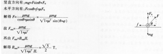 解析 (1)本题考查的知识点为安培力的计算和共点力作用下物体的平衡。 (2)该生没有考虑磁场的方向,默认了磁场是垂直于导轨的,因此错误。 正确解答过程:物体受力如右图所示: (3)教学思路:首先帮助学生突破思维定势——磁场垂直于导轨平面,即安培力在水平方向。首先带领学生回顾力的平行四边形定则。提出问题,金属棒除了受安培力还受到哪些力画出力的平行四边形示意图;深入引导,支持力与滑动摩擦力的合力方向和大小是否不变重力的大小和方向是否不变进行力的动态分析,找到最小的安培力,进而列式用数学方法求解最小值。
