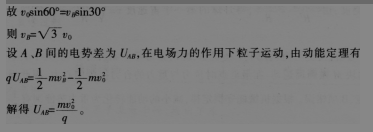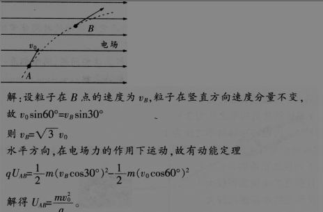 问题 阅读案例,并回答问题。 下面为一道物理试题和某学生的解答过程。 题目:如图,一质量为m、电荷量为q(q>0)的粒子在匀强电场中运动,A、B为其运动轨迹上的两点。已知该粒子在A点的速度大小为为vn方向与电场方向的夹角为60。:它运动到8点时速度方向与电场方向的夹角为30。。不计重力,求A、B两点间的电势差。 问题: (1)指出此道试题检测了学生所学哪些知识点。 (2)分析错误原因并给出正确解题过程。 (3)针对学生解题过程中存在问题,设计一个教学片段,帮助学生解决此类问题。