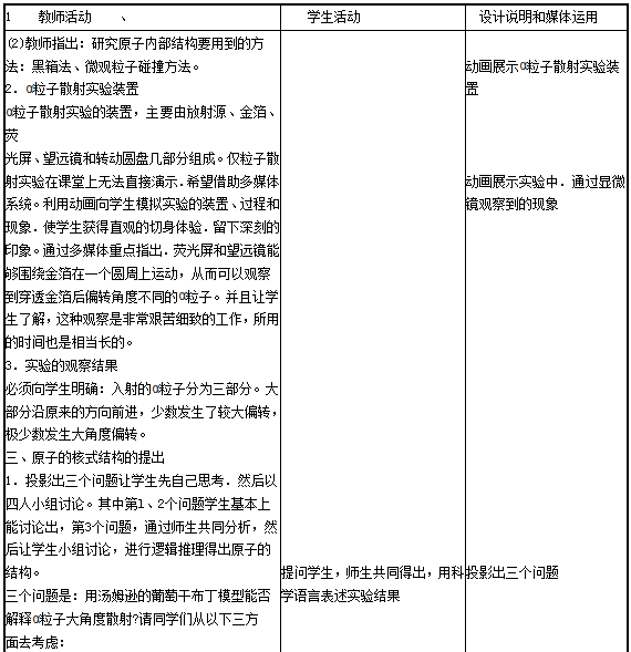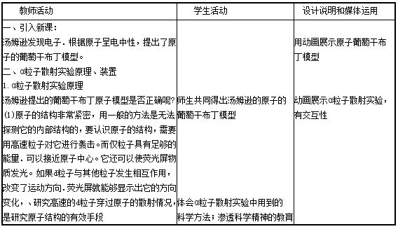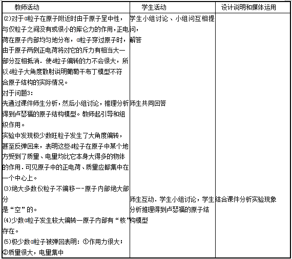 解析 (1)原子核式结构模型:在原子的中心有一个很小的核,叫原子核,原子的全部正电荷和几乎全部质量都集中在原子核里.带负电的电子在核外空间里绕着核旋转。 (2)教学设计如下: 一、教学目标 1.知识与技能 (1)了解原子结构模型建立的历史过程及各种模型建立的依据。 (2)知道α粒子散射实验的实验方法和实验现象,及原子核式结构模型的主要内容。 2.过程与方法 (1)通过对α粒子散射实验结果的讨论与交流,形成对现象的分析、归纳得出结论的逻辑推理能力。 (2)通过核式结构模型的建立,体会建立模型研究物理f:G题的方法,理解物理模型的演化及其在物理学发展过程中的作用。 (3)了解研究微观现象。 3.情感态度与价值观 (1)通过对原子模型演变的历史的学习,感受科学家们细致、敏锐的科学态度和不畏权威、尊重事实、尊重科学的科学精神。 (2)通过对原子结构的认识的不断深入,认识到人类对微观世界的认识是不断扩大和加深的,领悟和感受科学研究方法的正确使用对科学发展的重要意义。 二、教学重点 1.引导学生小组自主思考讨论对α粒子散射实验的结果分析,从而否定葡萄干布丁模型,得出原子的核式结构。 2.在教学中渗透物理学方法:模型方法。黑箱方法和微观粒子的碰撞方法。 三、教学难点 引导学生小组自主思考讨论对α粒子散射实验的结果分析,从而否定葡萄干布丁模型,得出原子的核式结构。 四、教学过程